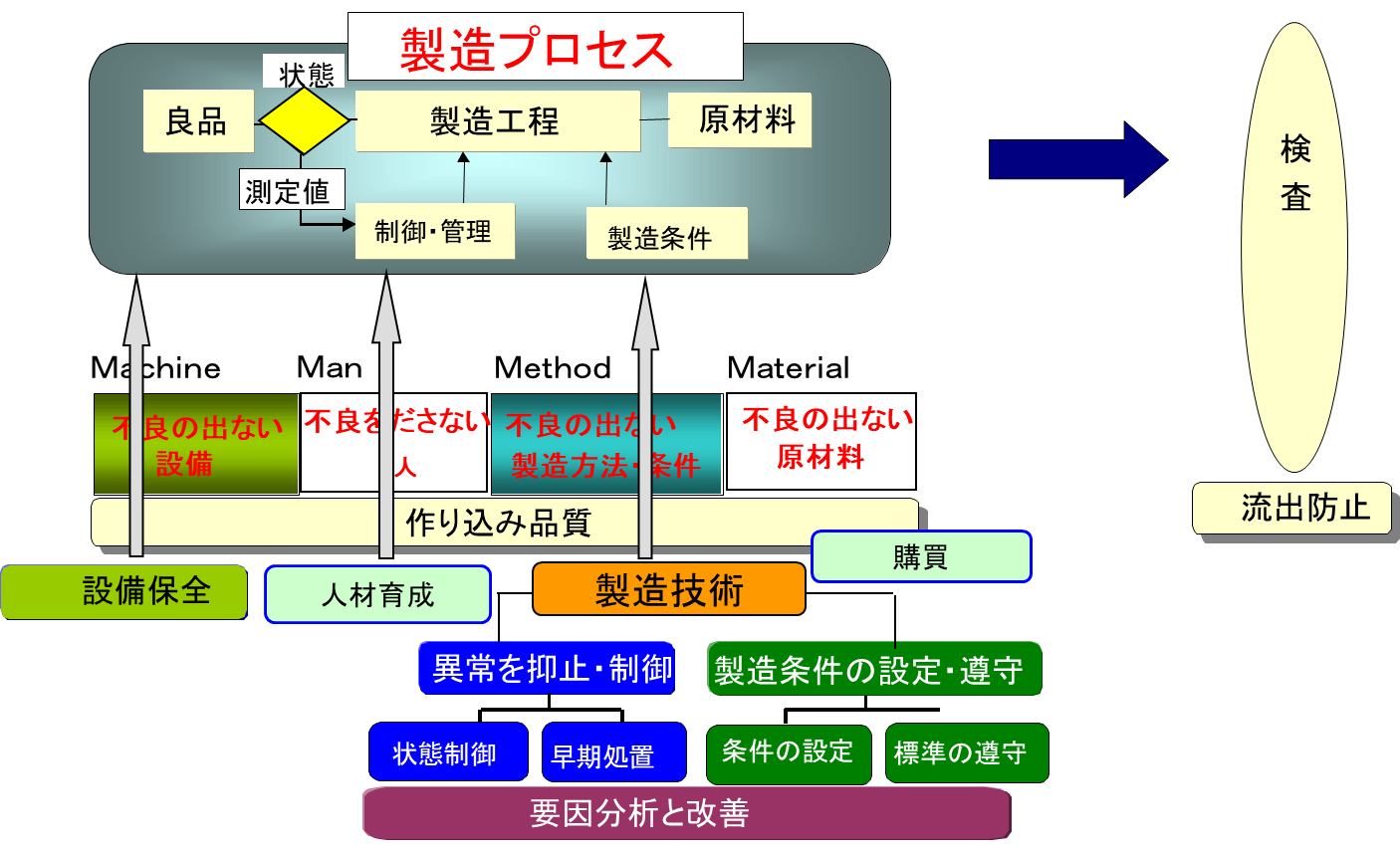 品质管控过程中,从【不流出工厂】→【不流动工厂内部的下一个工序】→【工序内不制造】的品质管控的体制构建。从而形成了日能三优咨询推行的【流出防止体制构建】以及【再发防止体制构建】2大方面。
